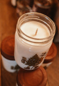 Hand-poured soy candles with rustic lid & cotton wick, Featuring Moss’ mascot, Truman the Treeman!