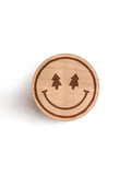 The Smiley Forest wooden pin is made by Forever Northwest and features a smiley face with trees for eyes. This pin measures roughly 1.25"x1.25" and is laser-engraved on cherry hardwood. No two are the same!