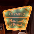 Olympic National Forest Lighted Signs are the perfect accent for your house, cabin, lodge, or vacation rental! Comes with 1" clear indoor/outdoor bulbs and a 10' black cloth covered power cord with switch. All lettering and borders are painted with an ivory white. and feature vintage-aged color finishes for the background.