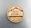 This wood magnet featuring the mountains, forests and water of the PNW measures approximately 2" x 2" with a 1.1" ceramic magnet on the back. This wood comes from the PNW!