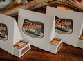 The entire design, both the cabin-shaped matchbox and the long matchsticks within, feels like a keepsake from a peaceful getaway in the woods—a miniature symbol of warmth, serenity, and the quiet beauty of nature.