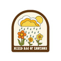 Isn't it usually a mixed bag of emotions? Embrace all those feels. This sticker depicts blooming flowers in the rain with some sun popping out. Mixed Bag of Emotions in lettering below. Illustrated in a 70s/retro style