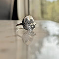 Introducing a solid silver fern ring - the perfect accessory for nature lovers. This stunning piece of jewelry is handcrafted by melting down high-quality silver into a ball, which is then hammered out to create a beautiful organic shape. A narrow band of silver is then fused onto it and an intricate fern design is stamped onto it. Hand illustrated by the artist, the fern design is a nod to the lush forests of the Pacific Northwest where ferns grow wild and free.