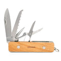 Materials: beech-wood handle with stainless steel 420: saw, knife, scissors, & awl.