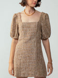 A charming mini dress crafted in sophisticated tweed fabric featuring a feminine square neckline and statement puff sleeves. The fitted silhouette is enhanced with an open back detail and structured bodice. Perfect for both daytime events and evening occasions, this dress combines vintage-inspired elements with contemporary design.