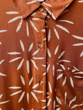 The abstract white sun print pops against a warm, autumnal orange—just the right touch of seasonal brightness. A patch pocket adds a little personality, while the flattering fit keeps it easy, relaxed, and endlessly wearable.