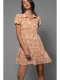 This mini dress boasts a striking abstract print in bold hues, paired with a tiered silhouette for playful movement. Its puff sleeves and collared V-neckline create a unique blend of vintage and contemporary styles.
