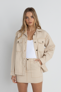 The Willa Stripe Jacket in Sand blends coastal charm with modern style. Made from 100% cotton drill with a yarn-dye striped twill fabric, it features a relaxed, oversized fit, as well as button front opening and buttoned chest pockets. Perfect for beachside strolls and artistic outings, it captures the essence of timeless adventures.