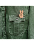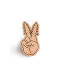 This wooden pin features a hand giving the peace sign and the two fingers are trees. This pin measures roughly 1"x1.6" and is laser-engraved on cherry hardwood. No two are the same!