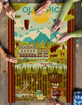 Original, high-quality 1000-piece puzzle featuring a graphic illustration of Olympic National Park adventurers at Lake Crescent Lodge.