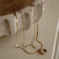 Two necklaces in one! Get this pre-layered style with the ease of one clasp. Hook and go! The Calista Layered Necklace features a north star pendant on an o-shaped chain with a crescent moon pendant on a snake chain.